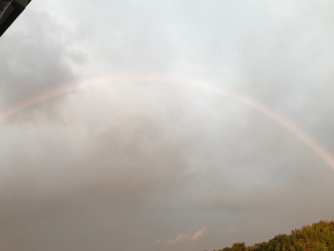 薄曇りの空にくっきりと、レインのボウが!