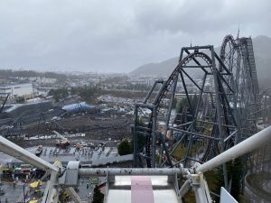 終盤の観覧車では、「横から雨が吹き込みますよ?」との係員さんのアドバイスに耳を貸さずに牢獄デザインのゴンドラに乗り込むも、上空の想像以上の風と薄着も相まってまさに何かの刑を受けているよう…