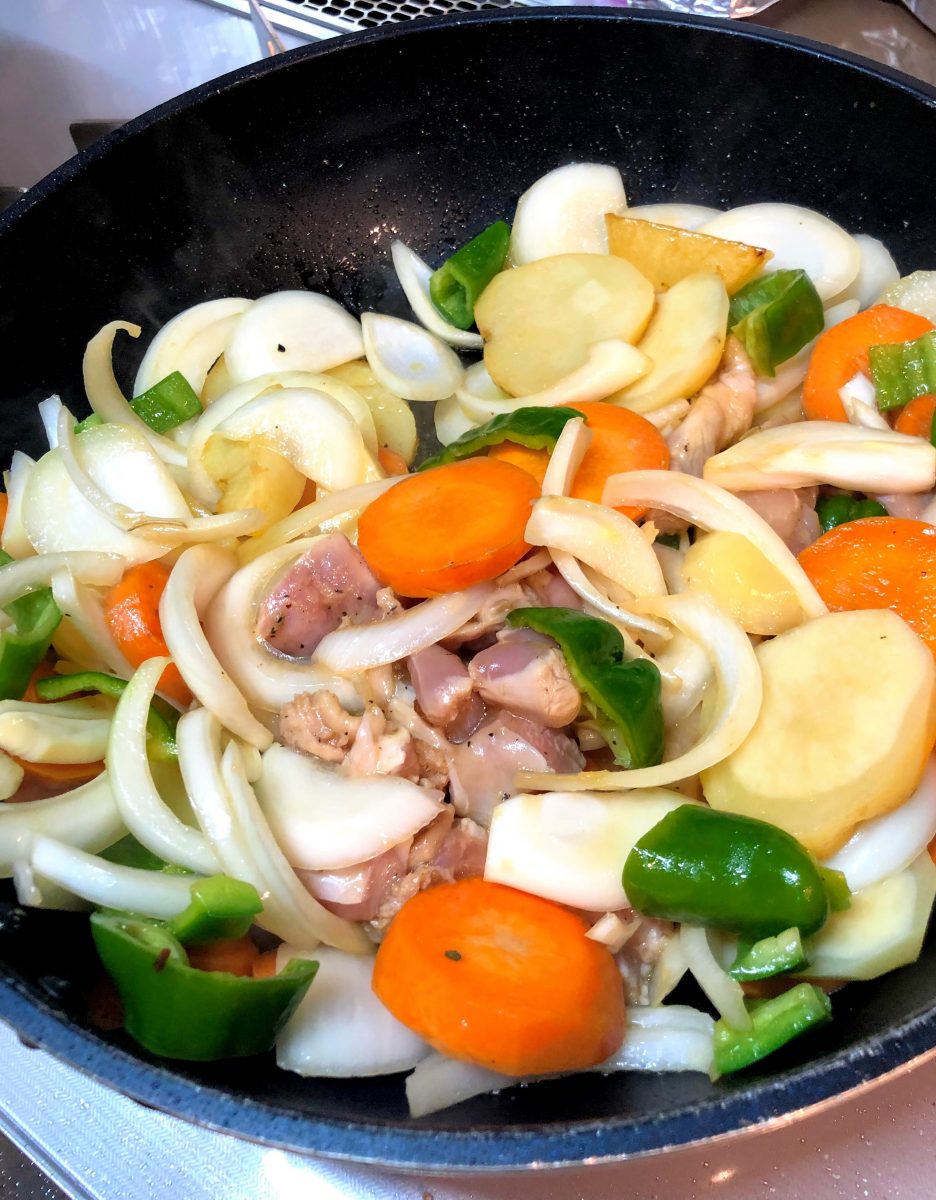 じゃがいも、たまねぎ、ピーマン、ニンジンを切り