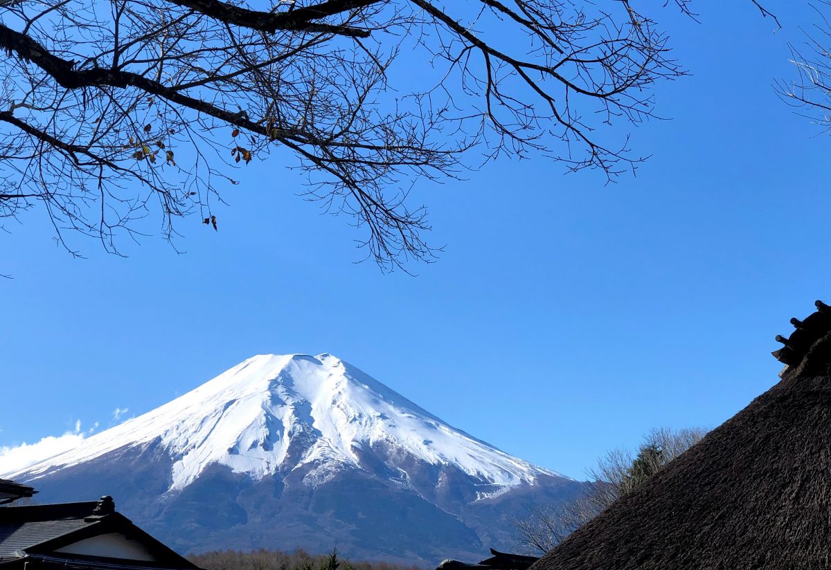 茅葺屋根と富士山、