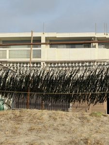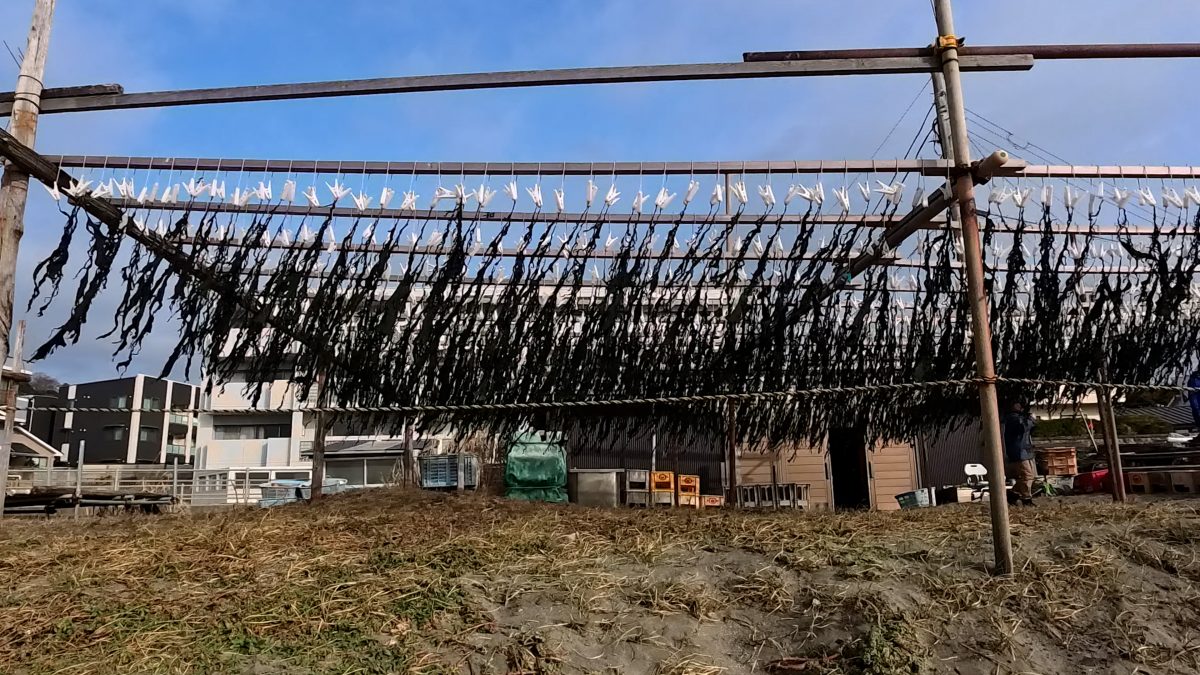 由比ヶ浜海岸では、わかめの天日干しが始まってました。
