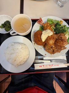 チキン(にんにく増増)、エビフライ、カニクリームコロッケのセットをチョイス