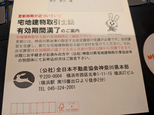 宅地建物取引士証 有効期間満了のご案内が届きました。