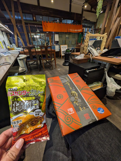 右は社長から頂いたお土産の辛子明太子、左は三瓶さんのお土産のバスセンターカレー味柿の種🎉