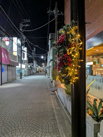 夜は、御成商店街のクリスマスの飾りつけ・・⛄