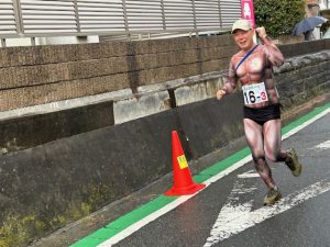 ココチーム3区走者のムキムキ岩井マンのすぐ背後を