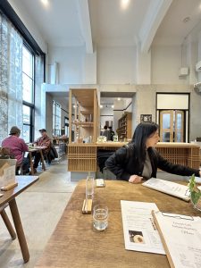 京都市電の詰所だった建物をリノベーションした、天井が高くて気持ちのよい空間!格子デザインの木製什器も丁寧で美しい。