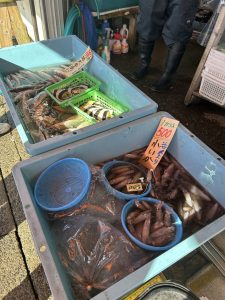 タコもいたのですがまだ元気に泳いでいて、私には殺生する勇気がなく、徳田さんと2人でかわいい小イカを買いました!