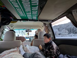 後部シートでちびっ子3人と雑魚寝。