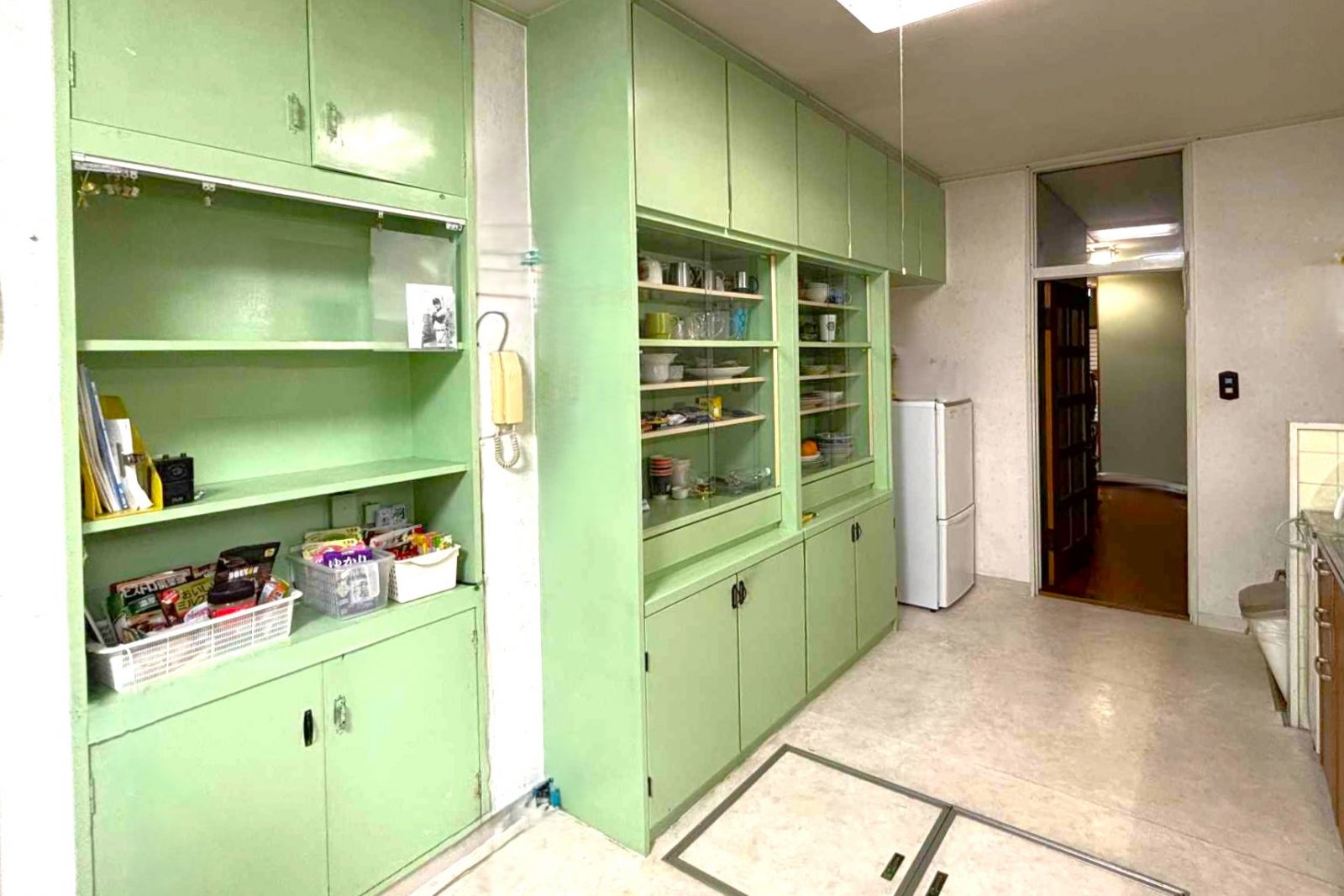 ダイニングキッチンは建築当時のままですが、天井までの棚は収納力たっぷり!