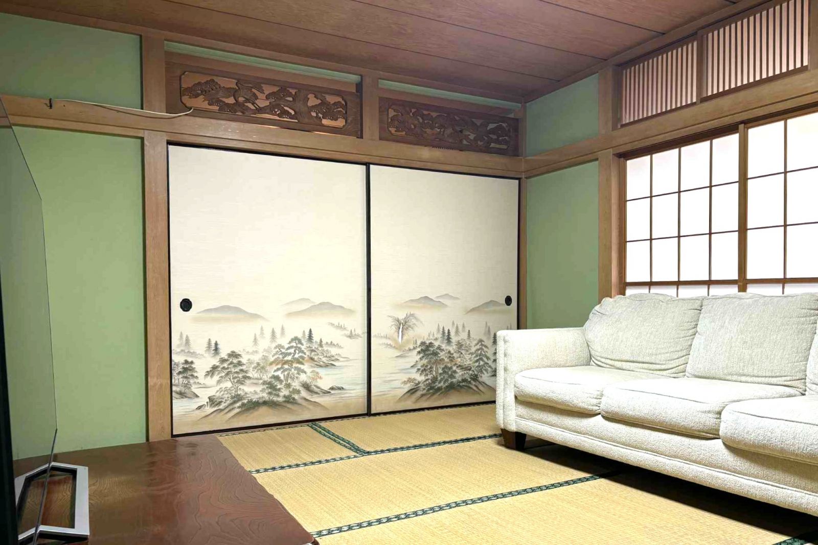 鶯色の塗壁と幅広の襖に描かれた松の木が落ち着きます。