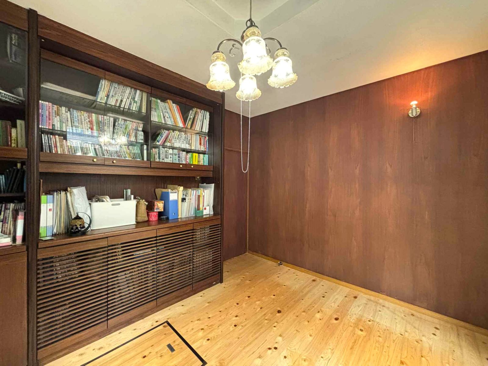 作り付けの大きなブックシェルフと建築当時からあったと思われるシャンデリアと壁付けのライトも雰囲気がいい。