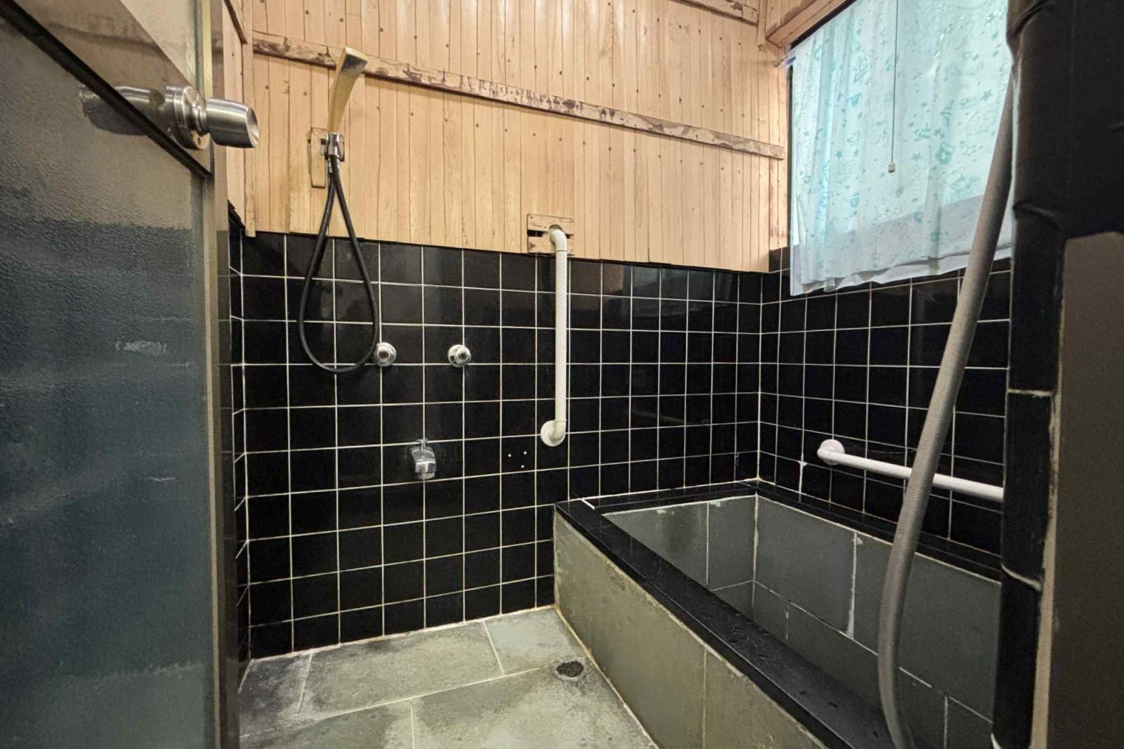 このタイルの壁と石の床のお風呂もいいですが、リフォームしたらもっと快適になりそうですね!