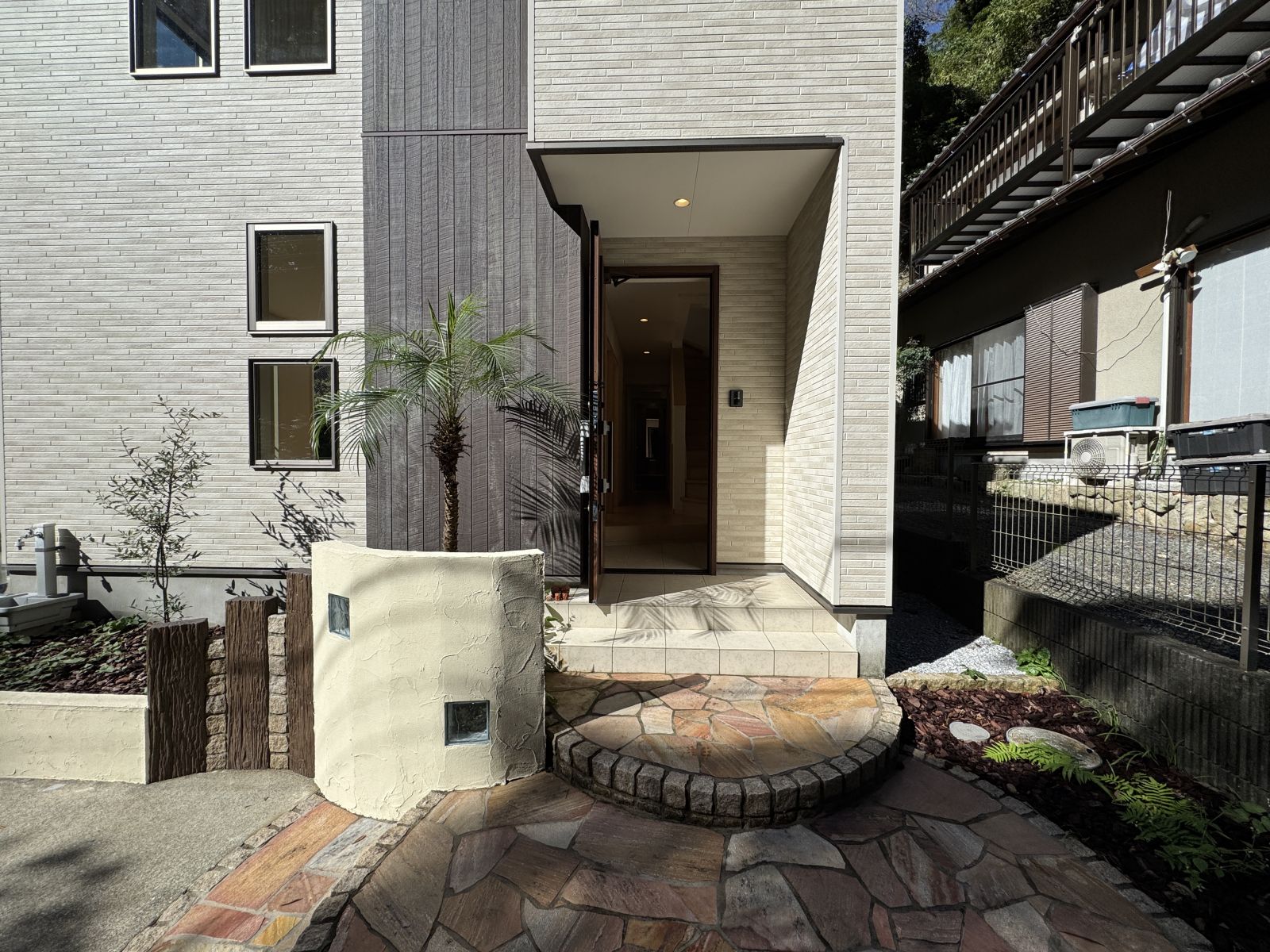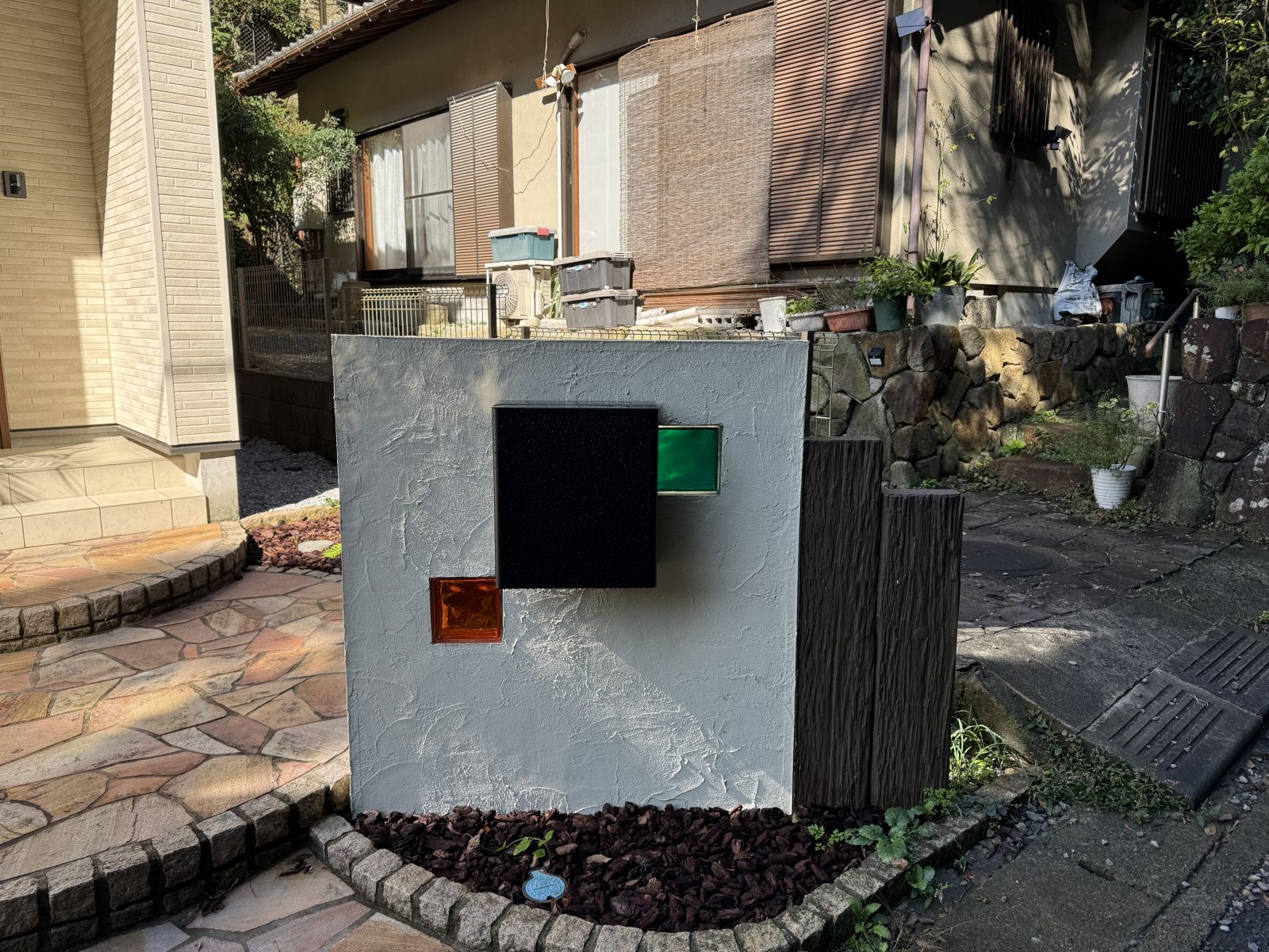 玄関アプローチには、郵便BOXとガラスオブジェ