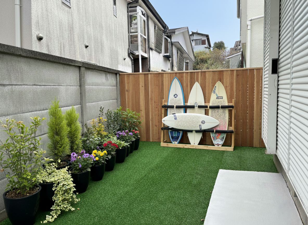 お庭にサーフボードラックを作ったり、グリーンを置いたりすると、、、
