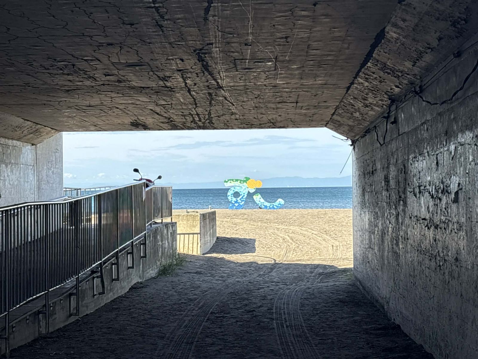 高架下の先には輝く青い海が広がっていて