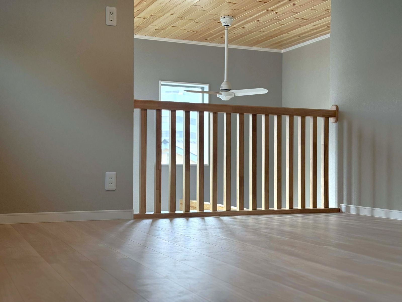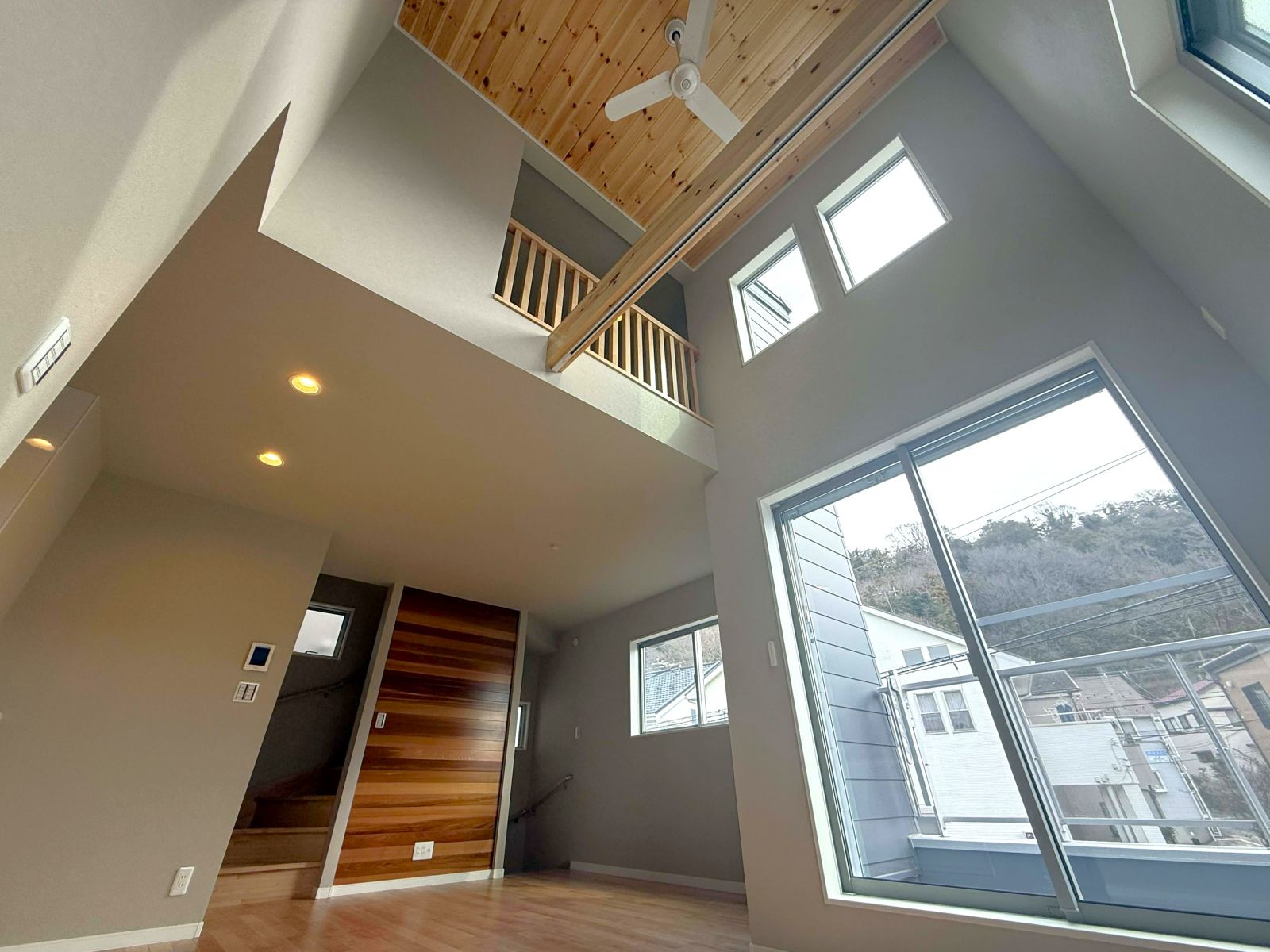吹き抜け天井はパイン材を使っており、爽やかなLDKを演出しております。