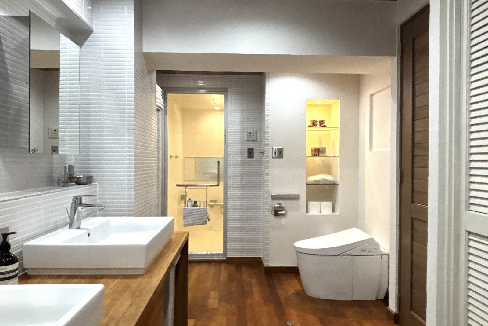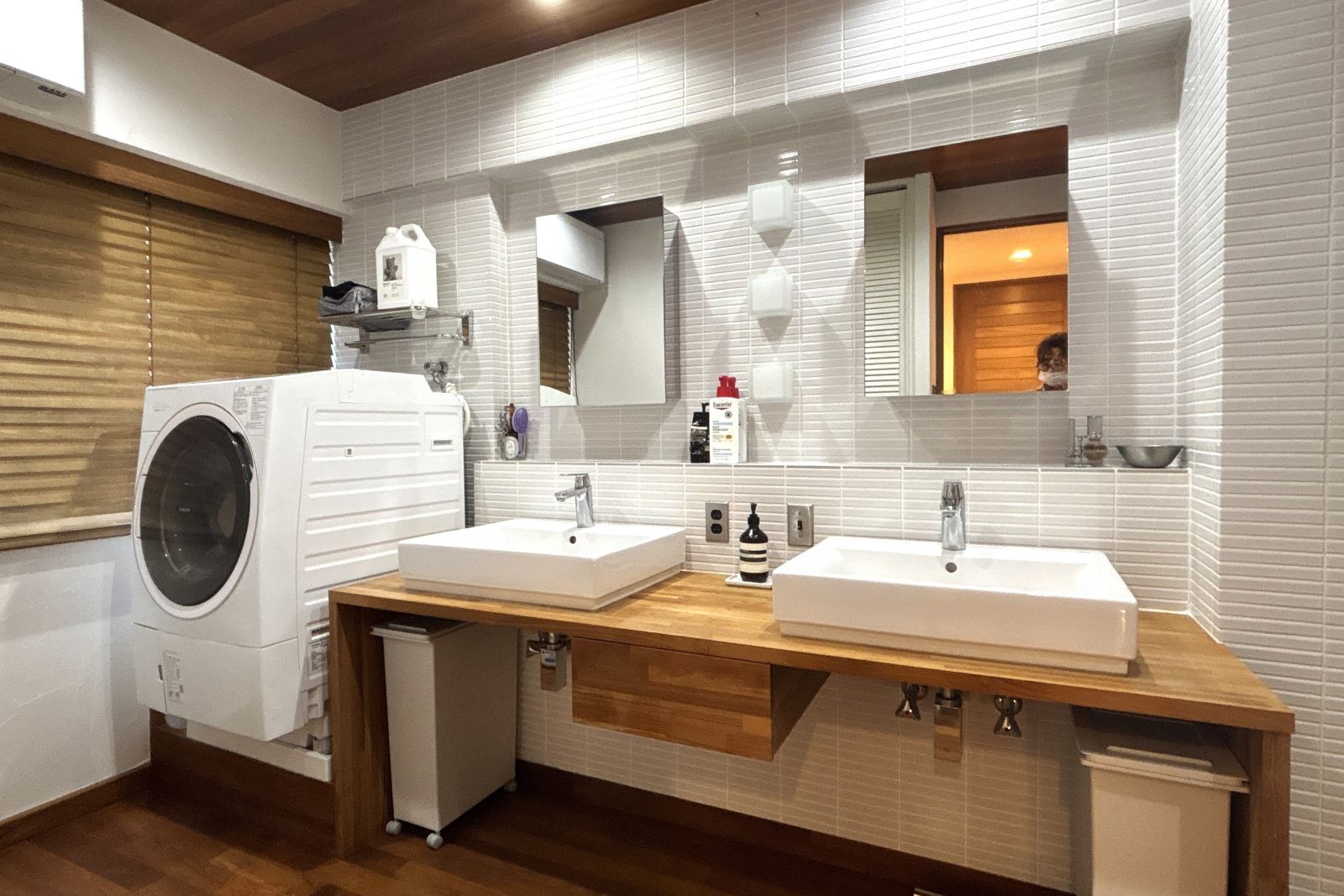 天然木とタイルという一見対照的な二つの素材が、この空間では驚くほど美しく調和しています。