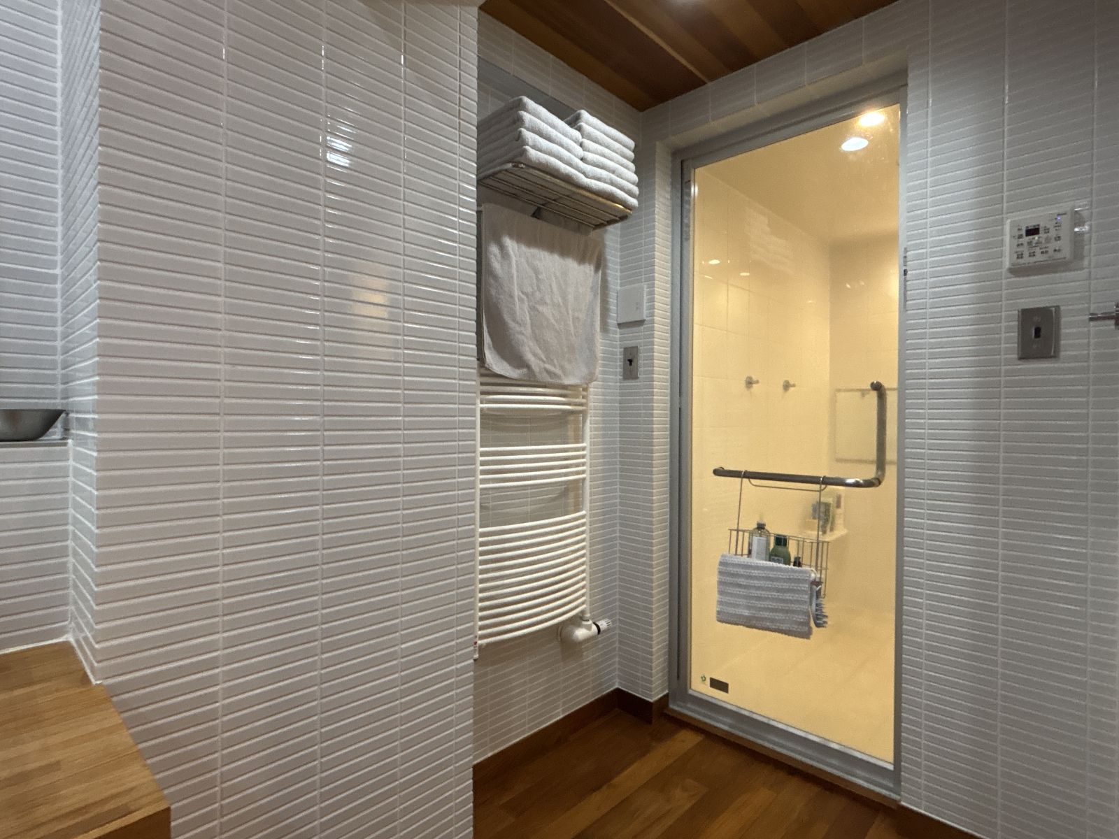 これがまた、チーク材の無垢フローリングとタイルの壁との相性がいいのです。